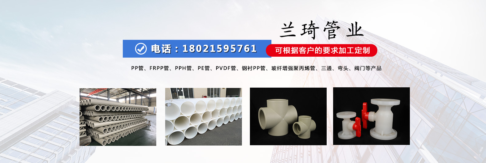 江蘇蘭琦管業制造有限公司是pp管、frpp管、pph管、pe管、pvdf管、鋼襯pp管、玻纖增強聚丙烯管、三通、彎頭、閥門等產品專業生產加工的公司,江蘇蘭琦管業制造有限公司的誠信、實力和產品質量獲得業界的認可。歡迎各界朋友蒞臨參觀、指導和業務洽談。